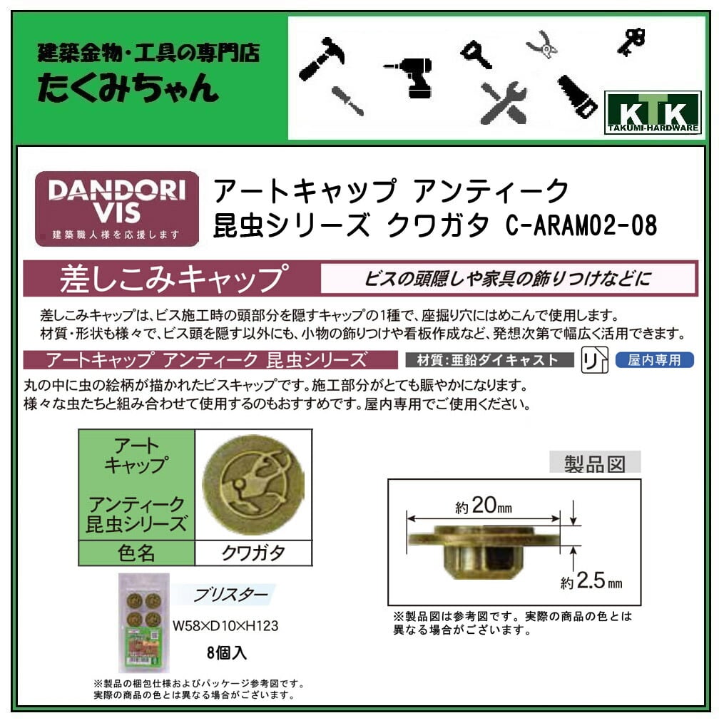 DANDORI VIS ダンドリビス 差しこみキャップ アートキャップ アンティーク 昆虫シリーズ クワガタ C-ARAM02-08 8個入 ブリスター