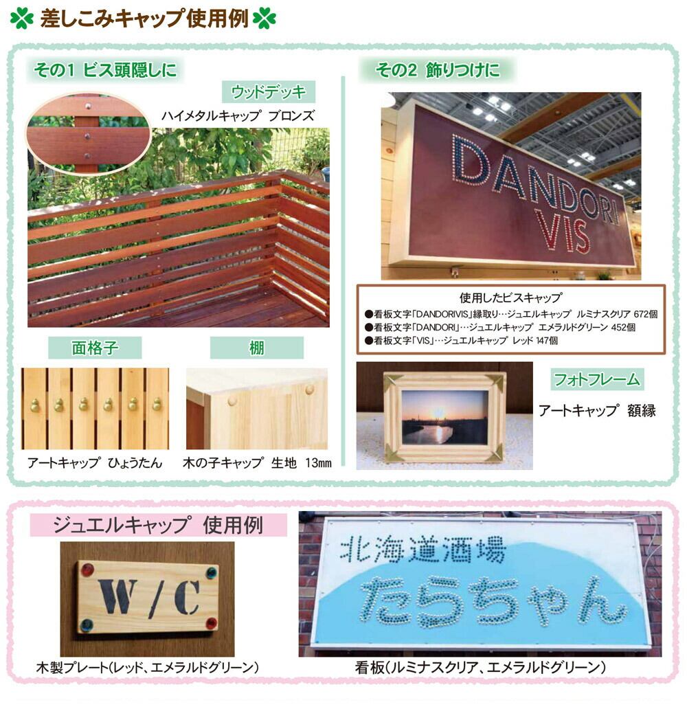 差しこみキャップは、ビス施工時の頭部分を隠すキャップの1種で、座掘り穴にはめこんで使用します。材質・形状も様々で、ビス頭を隠す以外にも、小物の飾りつけや看板作成など、発想次第で幅広く活用できます。