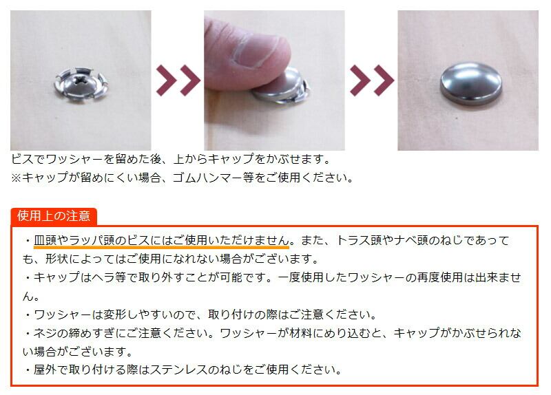 ・キャップがワッシャーにしっかり留まるので、いつの間にかキャップが外れて紛失してしまうことや、いたずらで外されてしまうことを防ぎます。