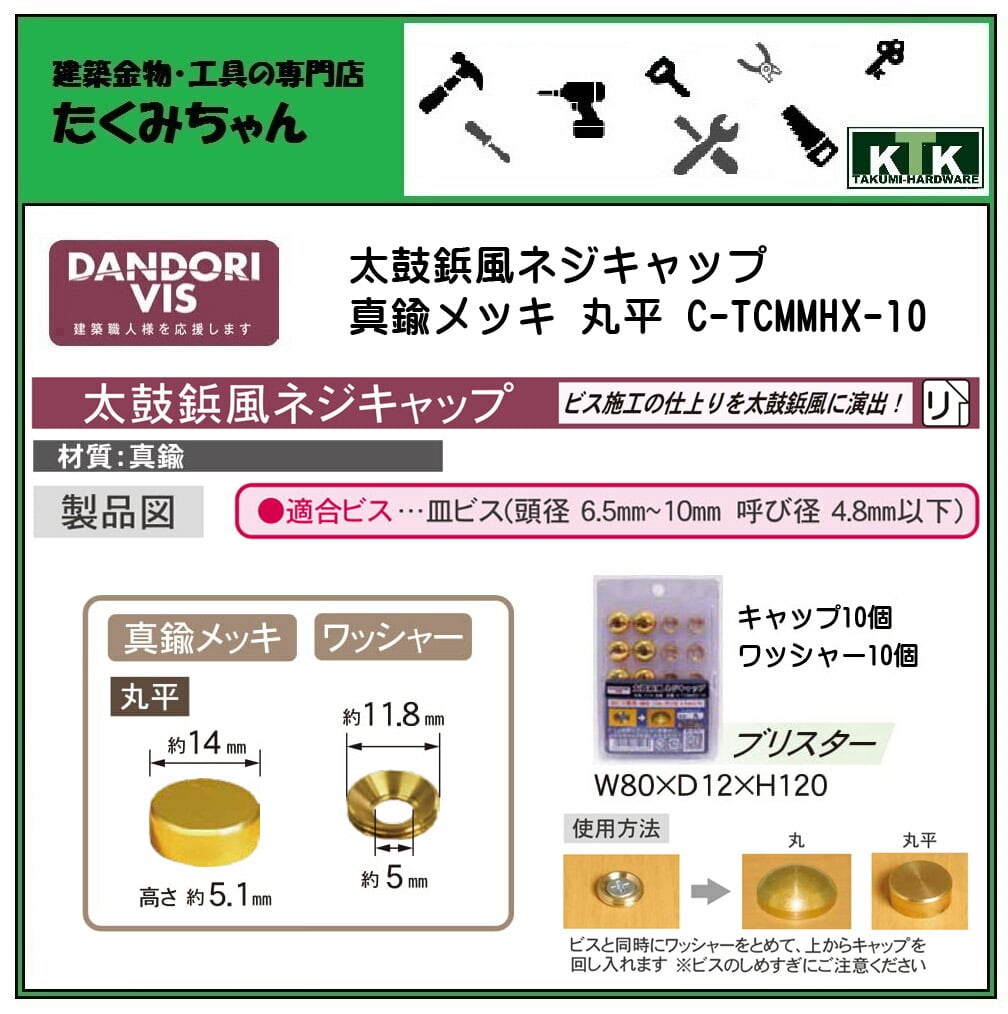 DANDORI VIS ダンドリビス 太鼓鋲風ネジキャップ 真鍮メッキ 丸平 C-TCMMHX-10 キャップ10個 ワッシャー10個入 ブリスター
