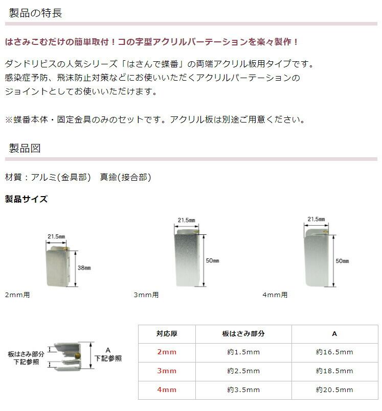 ダンドリビスの人気シリーズ「はさんで蝶番」の両端アクリル板用タイプです。