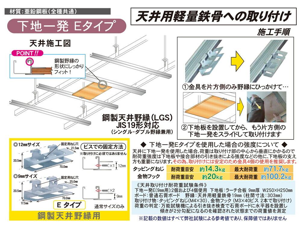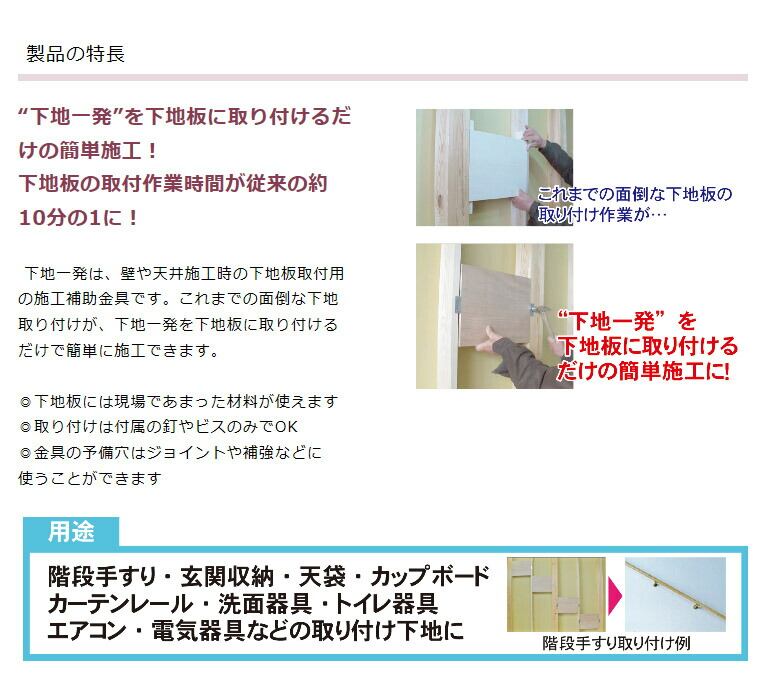 下地一発は、壁や天井施工時の下地板取付用の施工補助金具です。これまでの面倒な下地取り付けが、下地一発を下地板に取り付けるだけで簡単に施工できます。