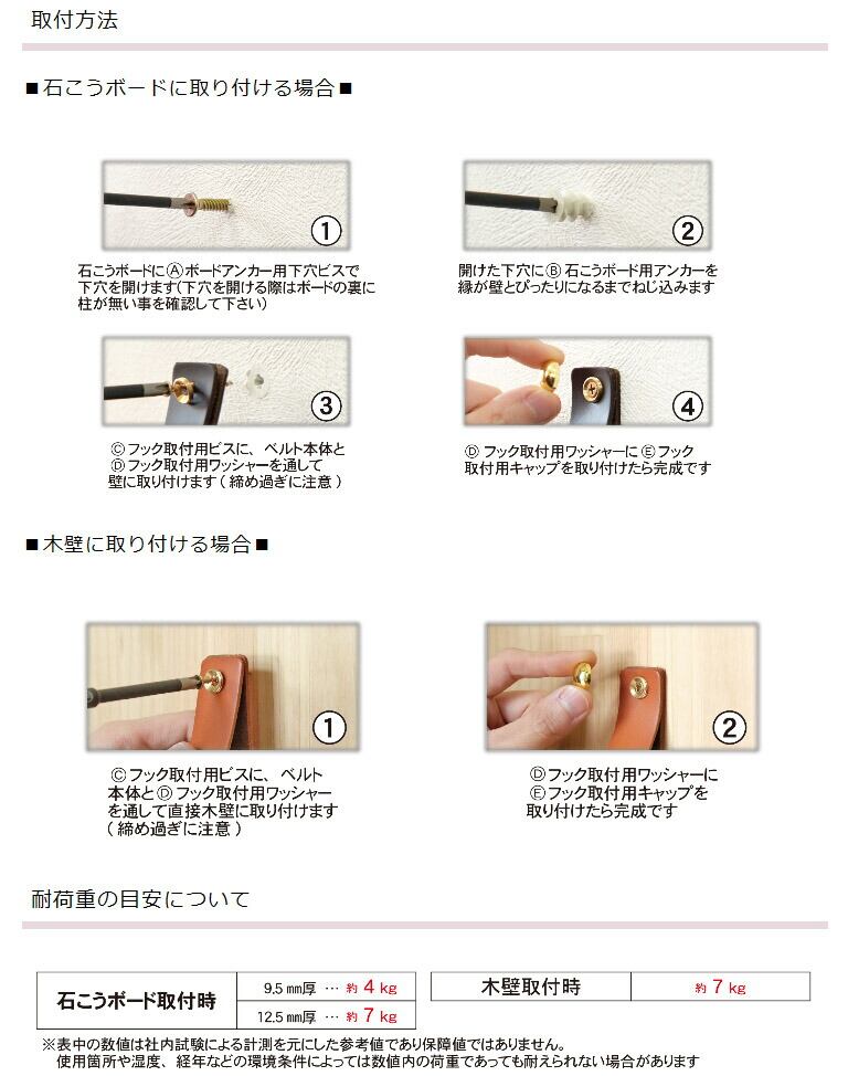 1.フック取付用ビスに、ベルト本体とフック取付用ワッシャーを通して直接木壁に取り付けます(締め過ぎに注意)。