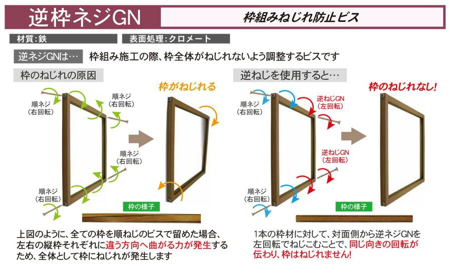 1本の枠材に対して、対面側から逆ネジGNを左方向にねじこむことで、同じ向きの回転が伝わり、枠はねじれません!